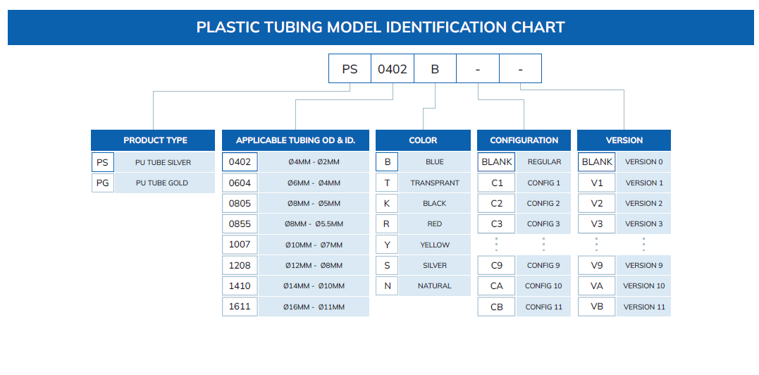 | PU Tube | PS0402B, PS0604B, PS0805B, PS1007B, PS1208B, PS1410B, PS1611B |